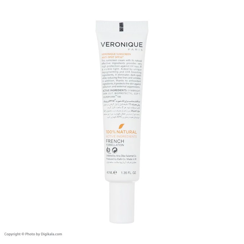 کرم ضد آفتاب ضد لک VERONIQUE دارای حجم 40 میلی لیتر میباشد. این کرم ضدآفتاب با ترکیبات موثر و طبیعی منجر به محافظت بسیار قوی در برابر اشعههای ماوراء بنفش و مادون قرمز میشود و به کاهش لکها کمک شایانی میکند. کرم ضدآفتاب ورونیک مدل ضدلک مناسب استفاده انواع پوست و فاقد چربی میباشد. محصولات ورونیک تولید ایران با فرمولاسیون فرانسه میباشند. کرم بواسطه دارا بودن ویتامین C دارای خاصیت آنتی اکسیدانی میباشد.