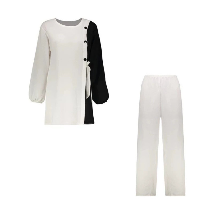 ست تونیک و شلوار زنانه مدل ابر و بادی کد 705 یکی از انتخابهای بهاری و تابستانی مناسب برای خانمهای شیکپوش است. این ست با جنس ابر و بادی خود، احساس راحتی و خنکی را به همراه دارد و مناسب برای استفاده در روزهای گرم و آفتابی میباشد. استفاده از جنس ابر و بادی در این ست، آن را به یک انتخاب مناسب برای فصل بهار و تابستان تبدیل کرده است. این جنس نرم و خنکی دارد که در مواجهه با آفتاب و هوای گرم، احساس راحتی و خنکی را برای پوست فراهم میکند. ست تونیک و شلوار ابر و بادی کد 705 دارای آستینهای بلند و قد زیر باسن است که به زیبایی و شیوهای خاص به این لباس میبخشد. این طراحی مناسب برای پوشیدن در روزهای معتدل بهار و تابستان است و احساس راحتی و آسایش را برای خانمها به ارمغان میآورد.رنگ تونیک ترکیبی از رنگ های سفید و مشکی میباشد.دارای دکمه مخفی در جلو پیراهن است که امکان اینکه به مشتری طبق سلیقه خود می تواند پارچه مشکی و سفید به هم متصل و یا باز باشد را می دهد