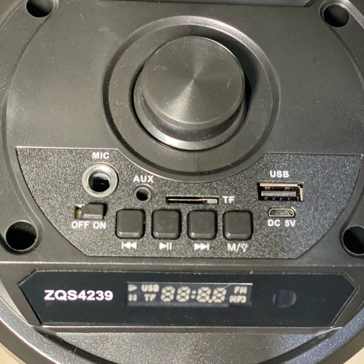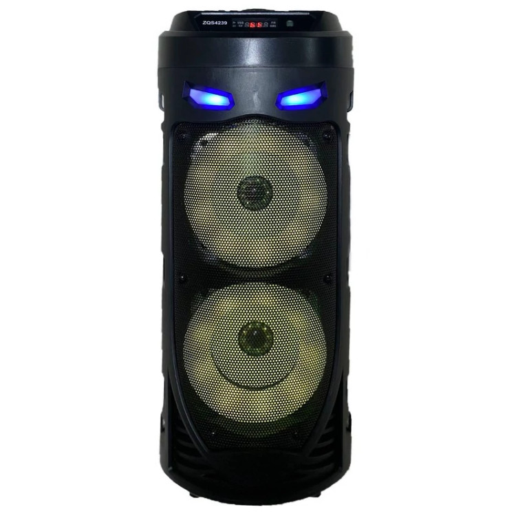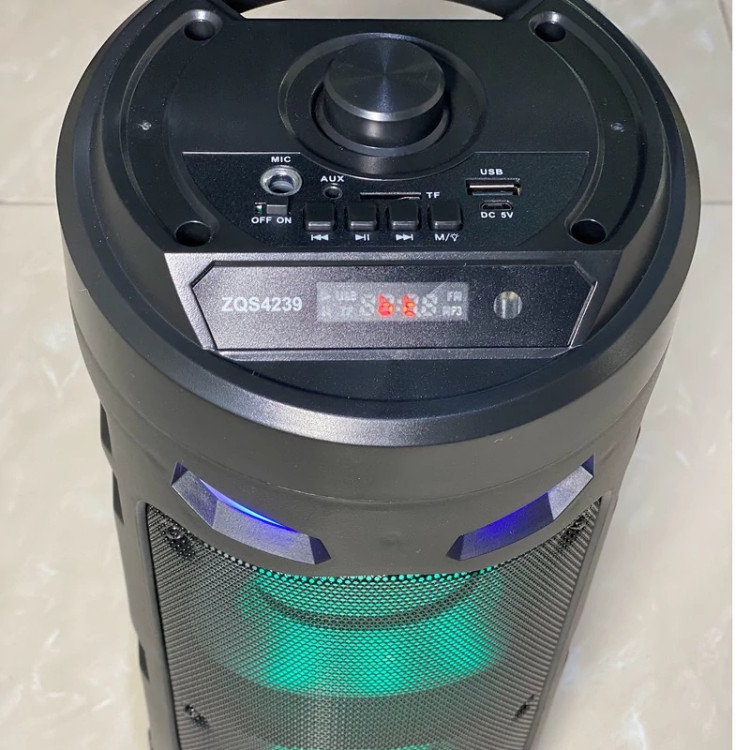 اسپیکر چمدانی بی سیم و قابل حمل مدل ZQS-4239 همراه میکروفن وایرلس و ریموت کنترل میباشد ابعاد اسپیکر40x20x20 سانتیمتر -بدنه محکم از مواد مرغوب ساخته شده است که مقاومت بالایی در برابر آسیب هایی نظیر ضربه و فشار از خود نشان میدهد این اسپیکر از کیفیت پخش صدای قدرتمندی برای جشن ها و مهمانی ها به خصوص در محیط باز و شلوغ برخوردار میباشد -درایو قدرتمند 12 اینچی این پارت باکس با توان خروجی معادل 1800 وات همچنان دارای نور پردازی داخلی در هنگام پخش موسیقی میباشد نمایشگر LED وپنلی از دکمه های فیزیکی جهت مدیریت موسیقی ؛ تنظیم ولوم ونور…. بر روی بدنه تعبیه شده ویک ریموت کنترل نیز همراه آن قرار دارد تا از راه دور این تنظیمات نیز برای کاربر امکان پذیر باشد- شارژ مجدد باتری نیز به وسیله آداپتور مخصوص قابل انجام میباشد ورودی شامل USB-AUX-BLUETOOTHمیباشد.