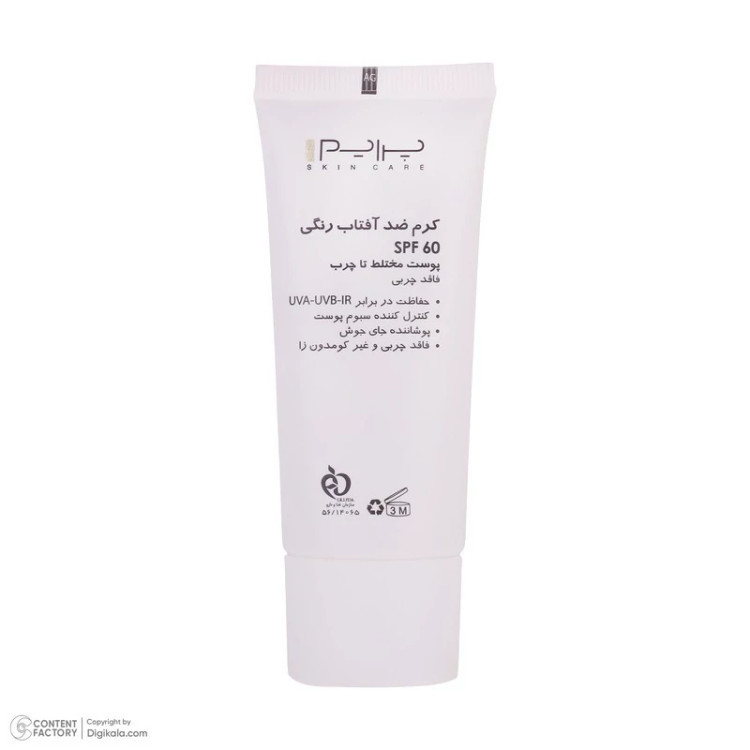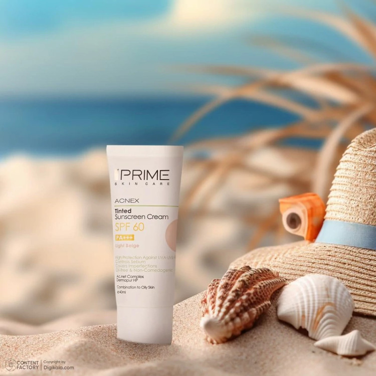 کرم ضدآفتاب رنگی SPF60 یکی از محصولات کارخانهی ایرانی «پرایم» بوده که به نام «Tinted Sunscreen Cream SPF60» نیز شناخته میشود و محصولی با کیفیت بالا در کنار رقبای خارجی است. این محصول محافظی قوی برای پوست در برابر اشعههای UVA، UVB، IR بهشمار میرود و با قابلیت کنترل ترشح سبوم و برخورداری از خاصیت ضدآکنهبودن، مهارکنندهی قوی باکتریهای مولد آکنه بهشمار میرود. این محصول ماتکننده و فاقد چربی به رنگ بژ روشن ارائه شده است و میتواند انواع لک و جای جوش را بپوشاند. بهترین روش مصرف این کرم ضدآفتاب پوشاندن پوست با مقدار کافی از کرم و 20 دقیقه قبل از قرارگرفتن در معرض نور آفتاب است. برای کسب نتیجهی دلخواه، بهتر است مصرفکننده هر دو ساعت یک بار، یک لایهی جدید از کرم روی پوست خود بکشد. همچنین در مواردی مانند تعریق شدید، شنا یا در ساعاتی از روز که تابش نور شدیدتر است، میتوان ضدآفتاب را در فواصل زمانی کوتاهتر تجدید کرد. حجم بطری آن 40 میلیلیتر است. این محصول که ویژهی صورت در نظر گرفته شده، برای پوست آقایان و خانمها ساخته شده است؛ بنابراین محدودیتی در جنسیت مصرفکننده ندارد و برای تمامی سنین مناسب است.