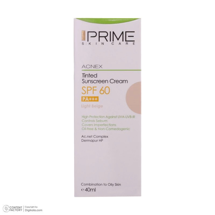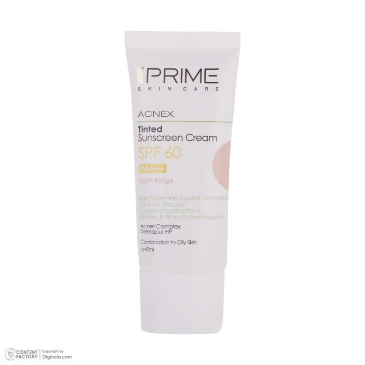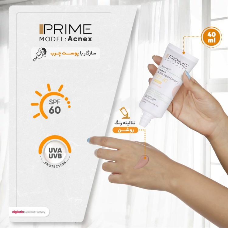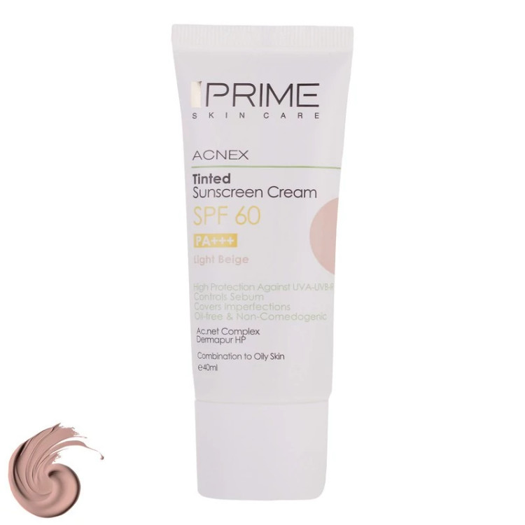 کرم ضدآفتاب رنگی پرایم SPF60 مدل Acnex، مناسب پوستهای چرب، حجم 40 میلیلیتر