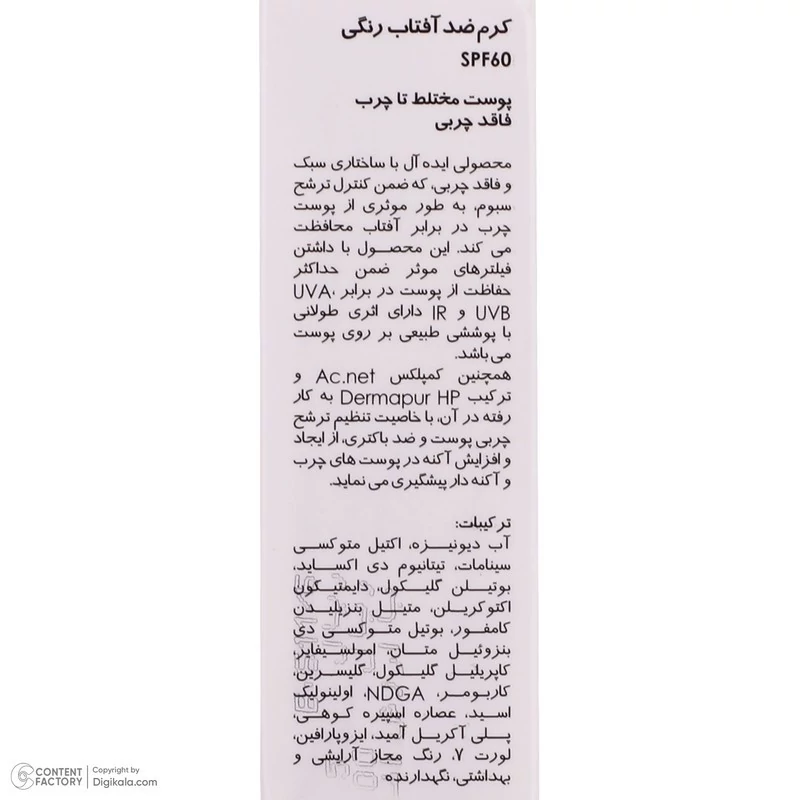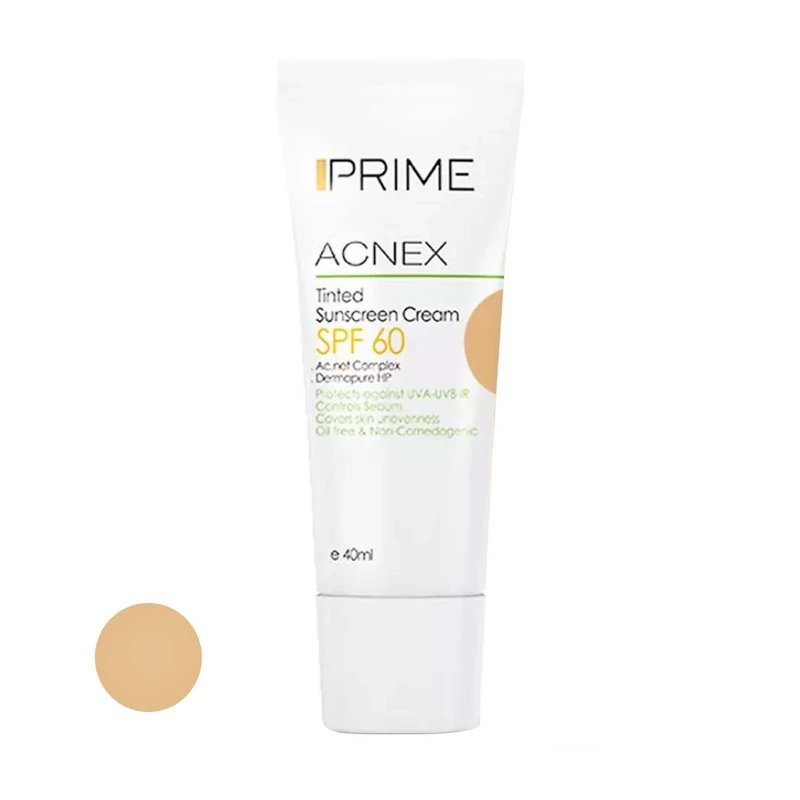 کرم ضدآفتاب رنگی پرایم SPF60 مدل Acnex، مناسب پوستهای چرب، حجم 40 میلیلیتر