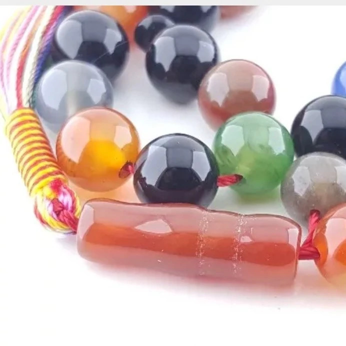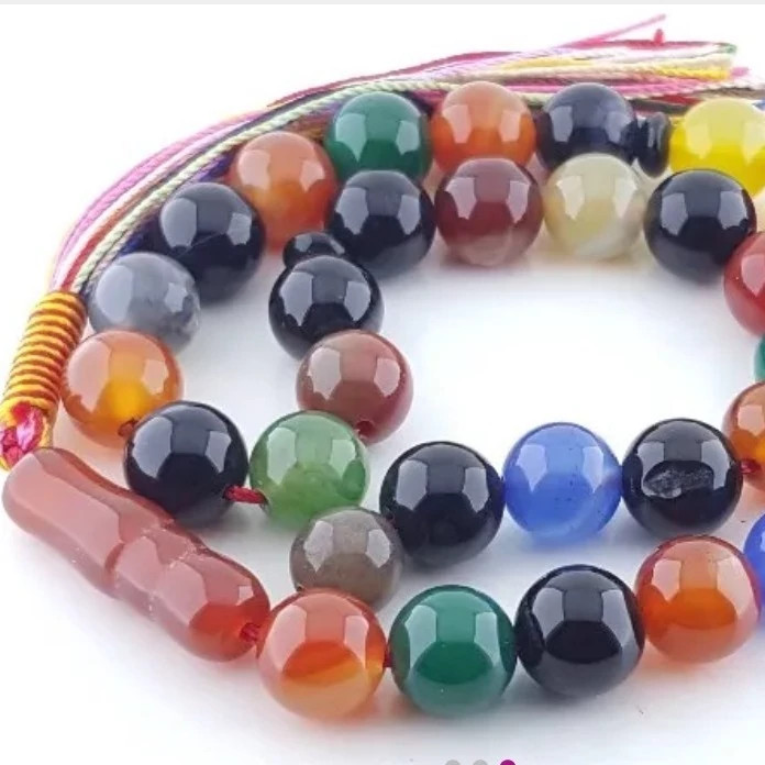 33 عددی سایز مهره ها 10 میلیمتر با شیخک و دانه های عقیق اصلی به رنگ آبی و سبز و زرد و ....