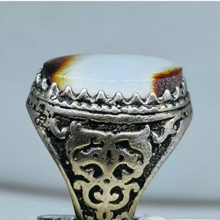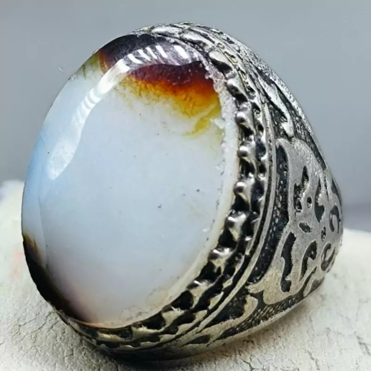 انگشتر نقره درشت عقیق یمنی تلفیقی عقیق کبدی و عقیق سفید یخی اصل یمن معدنی