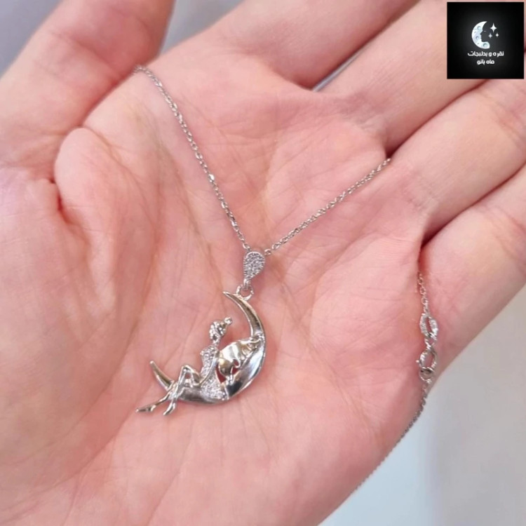 گردنبند نقره زنانه ماه و فرشته عیار 925و آبکاری طلا سفید ضد حساسیت با زنجیر فلامینگو 45سانتی