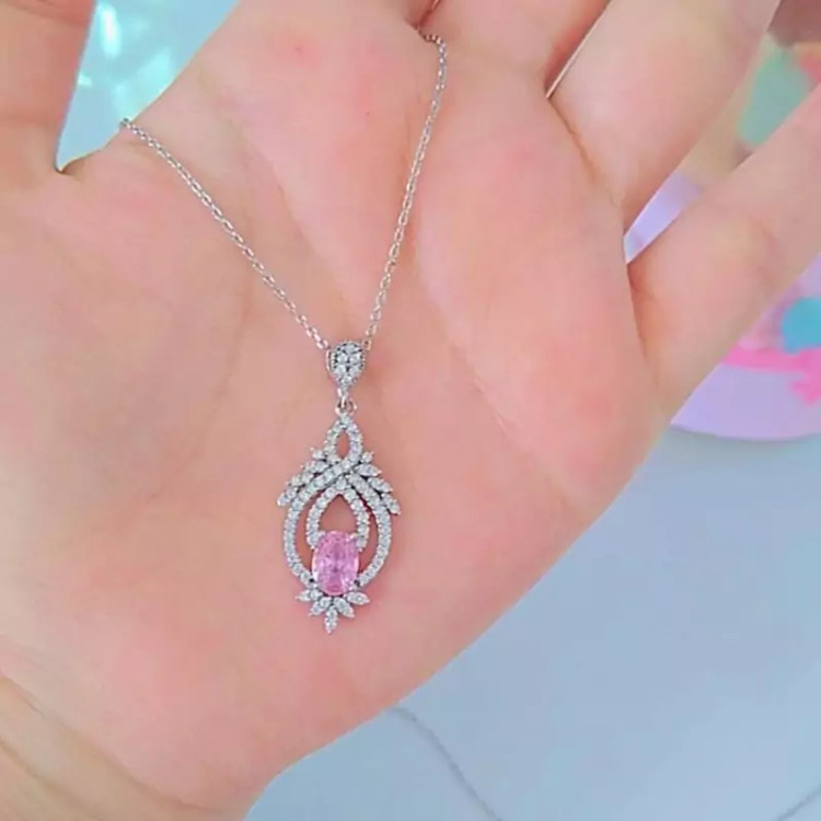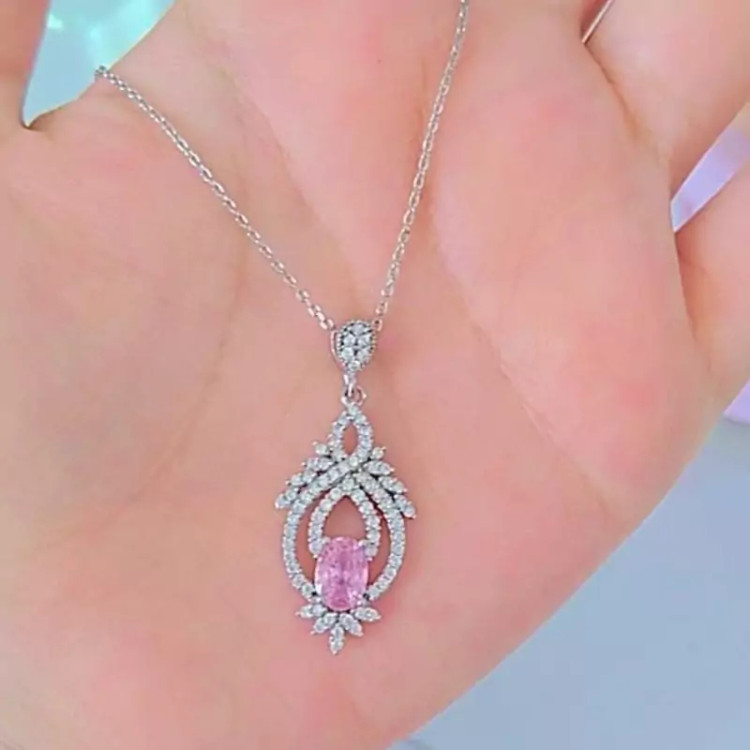 گردنبند نقره زنانه نگین صورتی باعیار925 و آبکاری طلا سفید