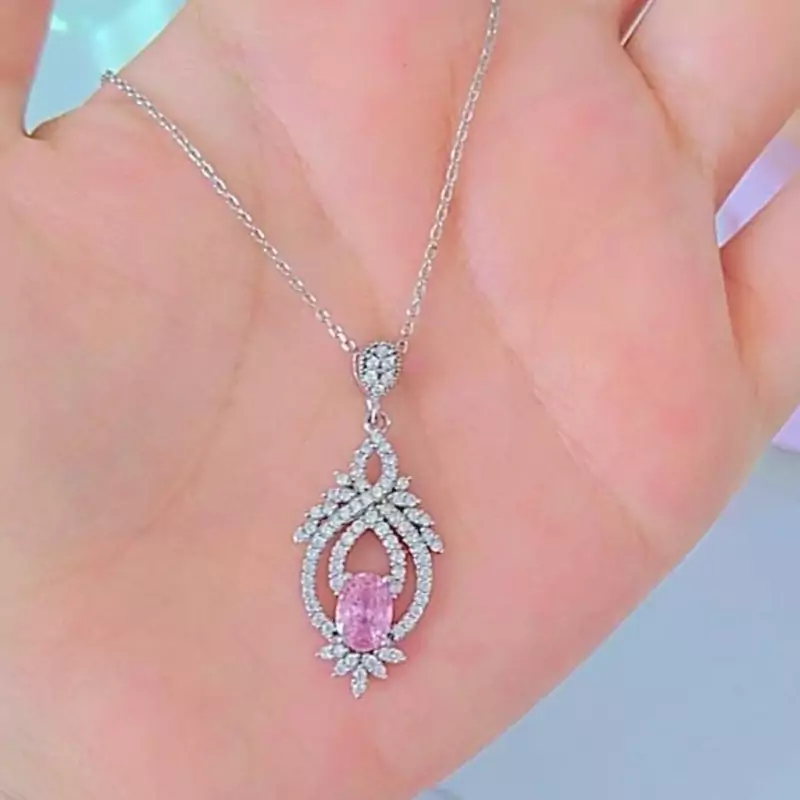 گردنبند نقره زنانه نگین صورتی باعیار925 و آبکاری طلا سفید