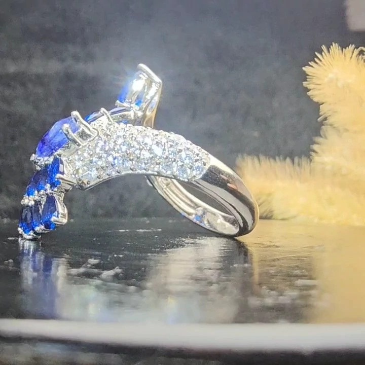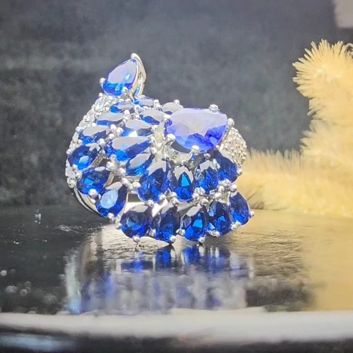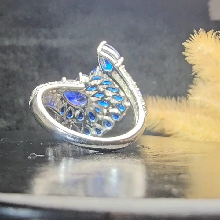 انگشتر نقره زنانه زیبای جواهری طرح طاووس با نگین یاقوت کبود اصلی معدنی طبیعی