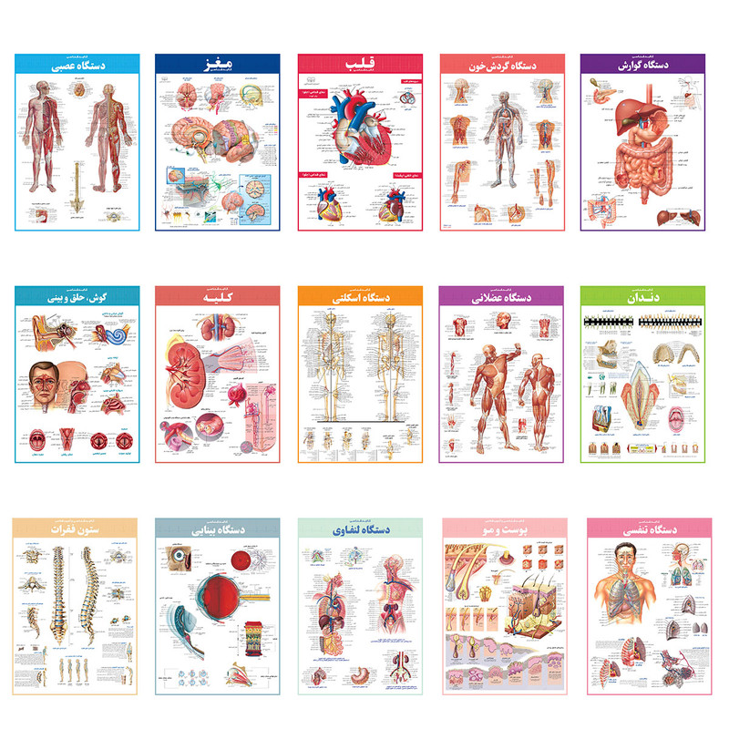 16 برگ پوستر آناتومی بدن انسان در اندازه 24×34 با روکش سلفون براق دارای قابلیت علامت گذاری (به صورت وایت بردی)