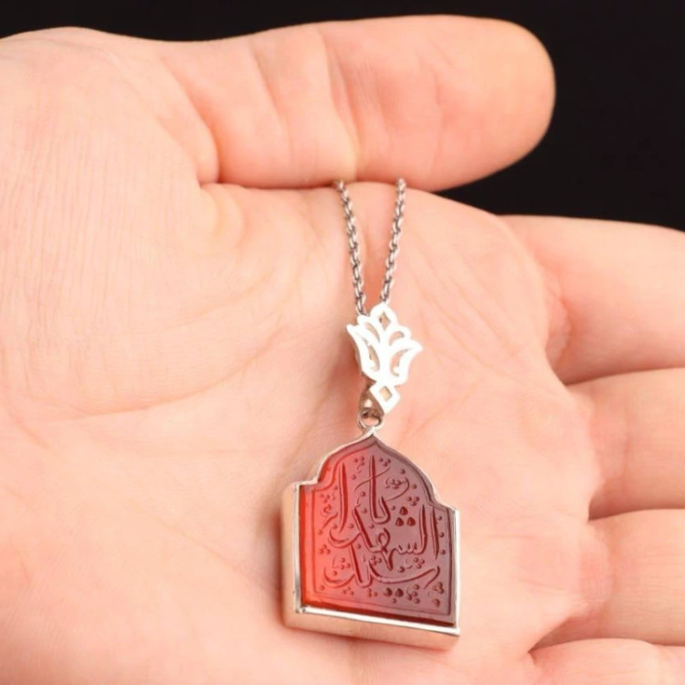 گردنبندنقره مردانه عقیق سرخ ذکرعزیزم سیدالشهدا قاب نقره دستساز