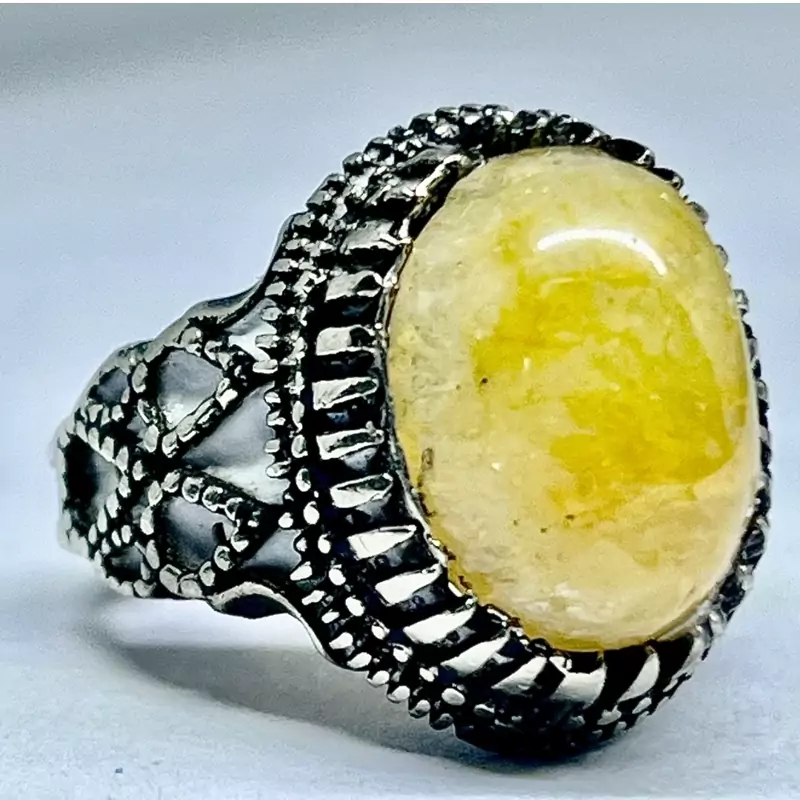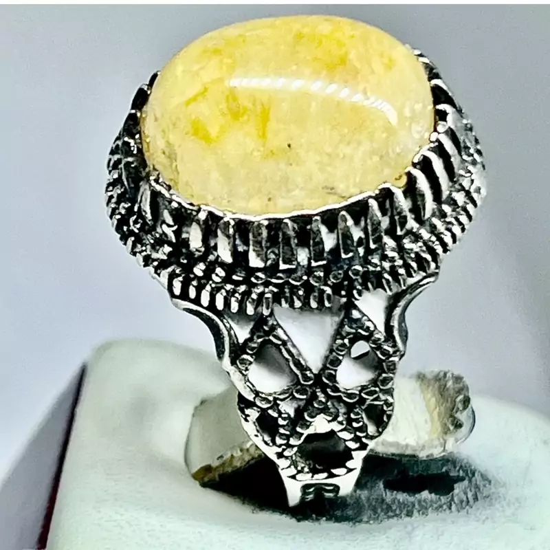 انگشتر مردانه یاقوت زرد آفریقایی کلاسیک زیبا و معدنی اصل با رکاب دندانه موشی و جوندار از رکاب نقره عیار متوسط آلیاژ 740 درصد استاندارد جهانی .....اندازه داخل رکاب حدود 19 میلیمتر میباشد