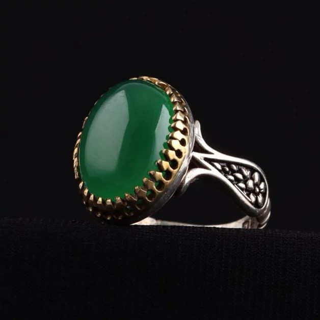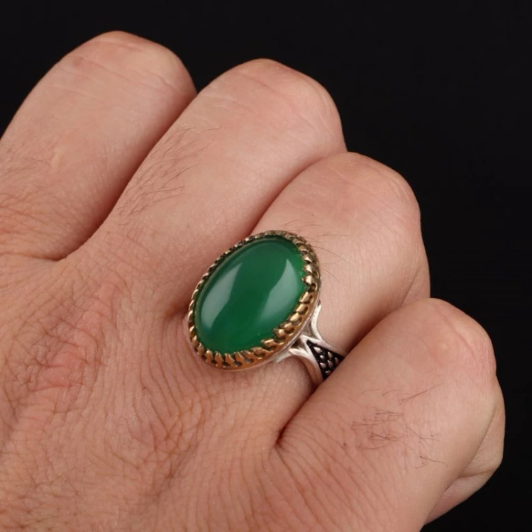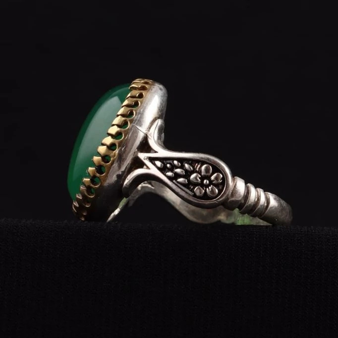 انگشتر مردانه عقیق سبز خراسانی رکاب تاج برنجی اصل ( انگشتر نقره مردانه )