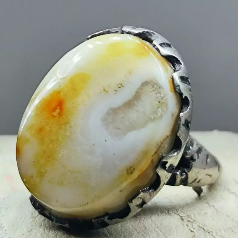 لامه معیشه اللبنانیه درجه یک که خالص ترین طبع سایمانی را داراست و دارای توصیه شدگی بی نهایت برای ادیهمذهبی بوده .همچنین کار دارای رگه های پوستی زرد زعفرانی و چشم های واضح درونی سنگ است که ارزش و کلکسیونی بودن کار را چندین برابر نموده است.
