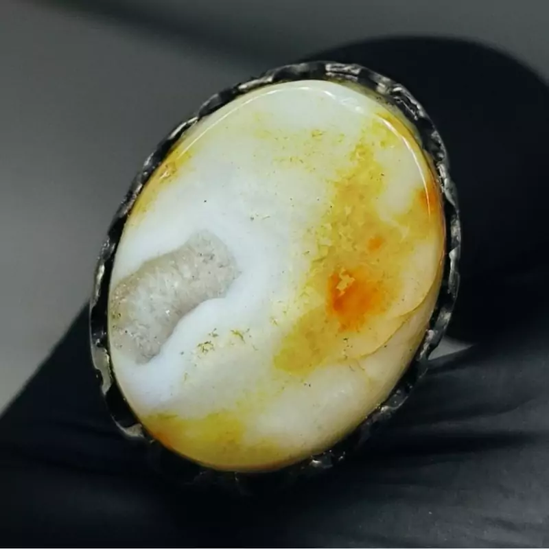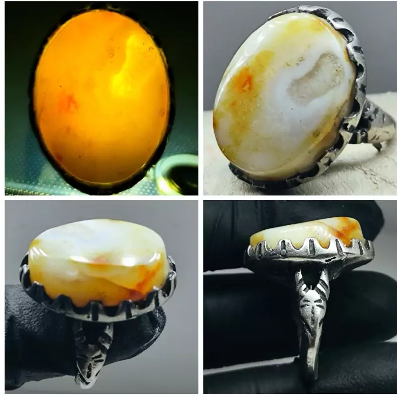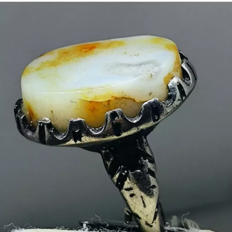لامه معیشه اللبنانیه درجه یک که خالص ترین طبع سایمانی را داراست و دارای توصیه شدگی بی نهایت برای ادیهمذهبی بوده .همچنین کار دارای رگه های پوستی زرد زعفرانی و چشم های واضح درونی سنگ است که ارزش و کلکسیونی بودن کار را چندین برابر نموده است.