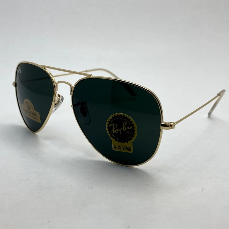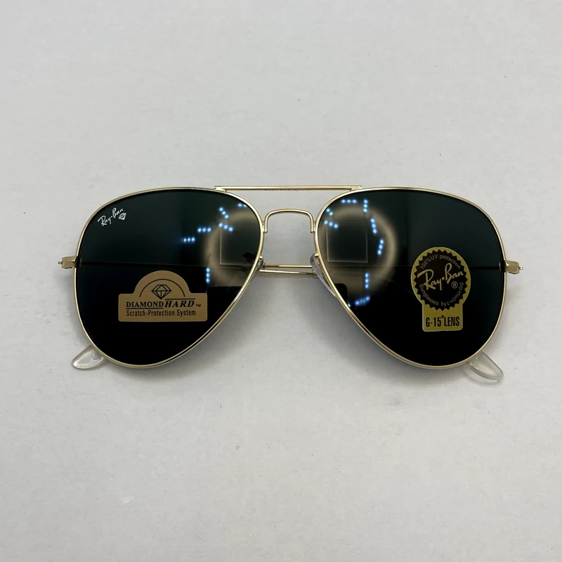عینک آفتابی خلبانی ریبن reyban شیشه سنگ آمریکایی آنتی رفلکس مشکی فریم طلایی سایز 62 به همراه پک کامل اورجینال RB 3026