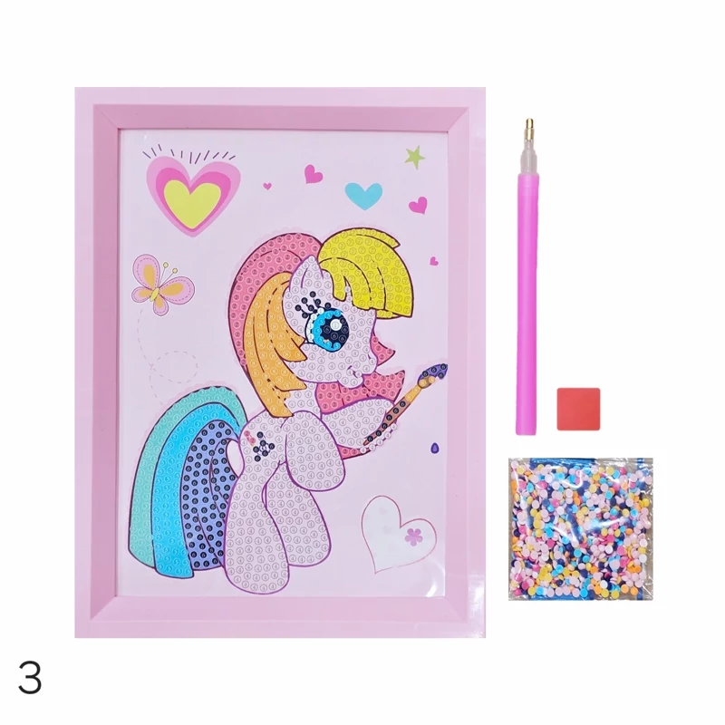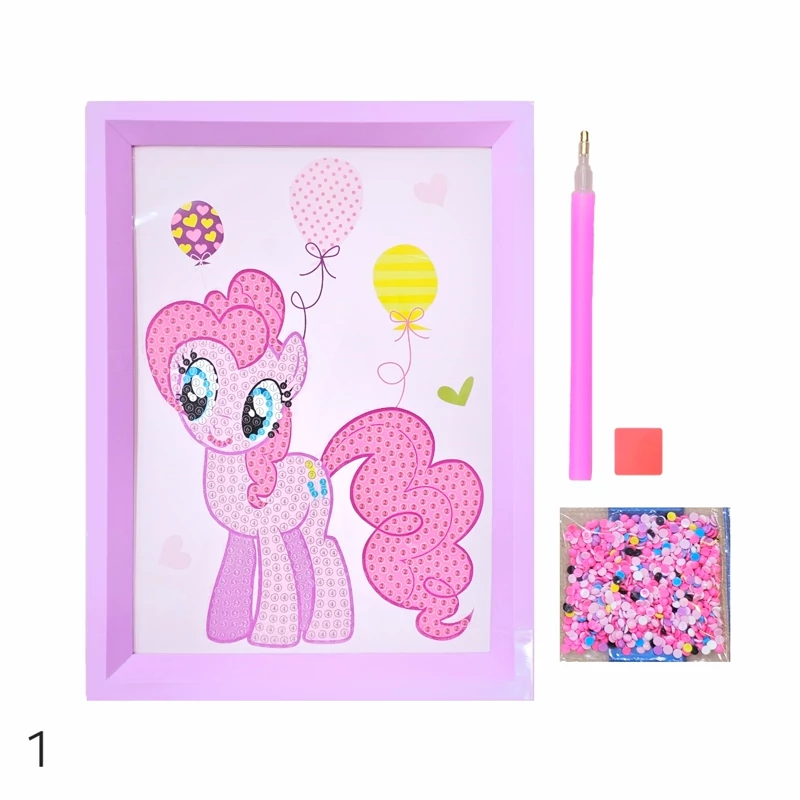 طرح پونیها (My Little Pony) همواره یکی از طرحهای پرطرفدار میان کودکان، مخصوصاً دختر بچهها است. رنگهای شاد، شخصیتهای بانمک و فضای دوستانه این طرح، احساس شادی، الهام و دوستی را به کودک منتقل میکند. این ترکیب باعث میشود کودک با شوق بیشتری تا پایان کار ادامه دهد و اثر نهایی را به عنوان یک تابلوی دکوراتیو یا هدیه نگهداری کند.