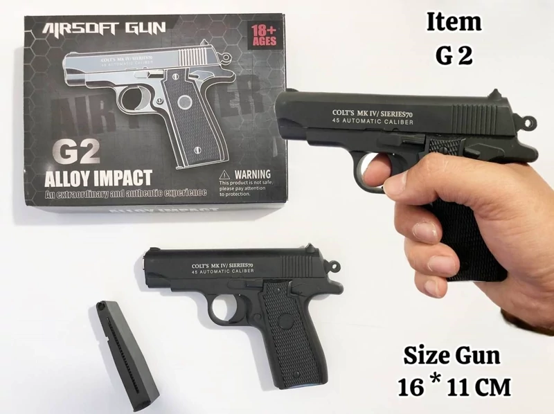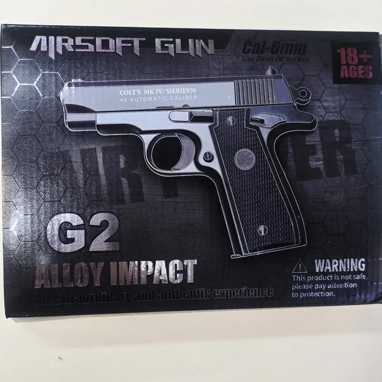 کلت فلزی ساچمهای مدل G2 یک اسلحه تفریحی ایر سافت (Airsoft) با طراحی شبیهسازی شده از نمونههای واقعی و ساختهشده از آلیاژ فلزی مقاوم است که برای تمرین نشانهگیری و کلکسیون مدلهای سلاح طراحی شده.