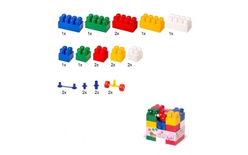 اسباب بازی آجره ۲۲قطعه بافرزندان شامل ۱۴قطعه آجره در سایزهای مختلف و رنگ های شاد و روشن، ۶قطعه اتصال و ۲ قطعه چرخ می باشد که بر روی دو قطعه از آجرها برچسب چشم و بر روی یکقطعه برچسب دهان وجود دارد تا کودک بتواند اشکال بامزه بیشتری بسازد و ارتباط بیشتری با ساخته ی خود برقرار کند.