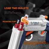 این تفنگ اسباب بازی دارای 6 عدد پوکه و محفظه تیر فومی و 6 عدد تیر فومی و اسفنجی می باشد. در این مدل تیرهای اسلحه و تفنگ از جنس اسفنجی یا فومی با سر و نوک چسبنده می باشد. تیرها بسیار سبک و کاملا بی خطر می باشند.
