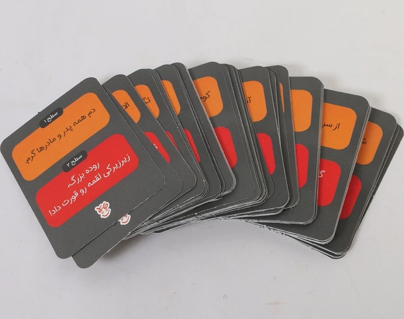 محتویات جعبه شامل مجموعهای از کارتها یا ابزار محرک، نشانگرها، و دفترچه قوانین رنگی است که با طراحی گرافیکی شاد و چشمنواز ارائه شدهاند. جنس وسایل بهگونهای است که در برابر استفاده مکرر مقاوم بمانند و برای جمعها و مهمانیهای پرشور مناسب باشند.