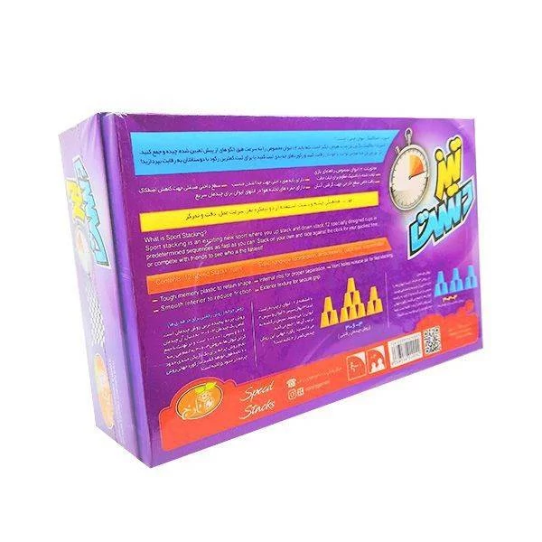 اقلام همراه : 12لیوان استاندارد برای بازی لیوانچینی (اسپید استاکینگ)، 48 کارت بازی، دو عدد تاس رنگ و شکل، 9 کارت گرد کوچک،9برچسب و دفترچهی قوانین