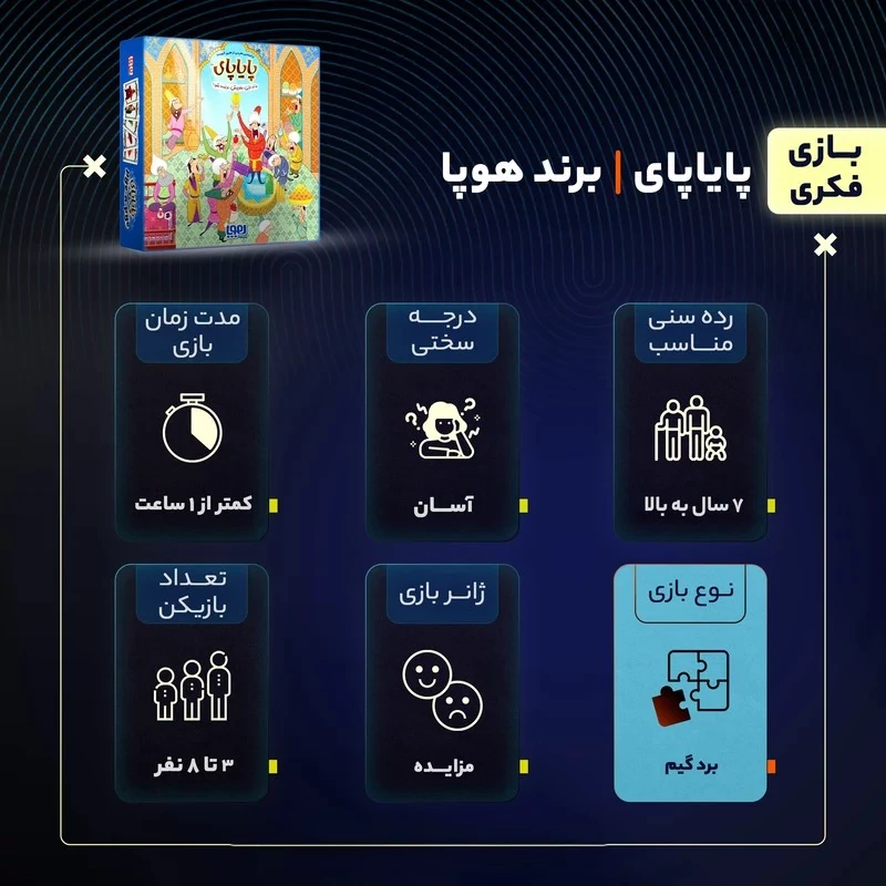 از متریال کارتها تا جعبه مستحکم، همه چیز در پایاپای طوری طراحی شده که هم زیبا باشه و هم موندگار. رنگبندی جذاب و آی콘های واضح باعث میشه بازی حتی برای بچهها هم قابل فهم باشه و یادگیری سریع باشه.