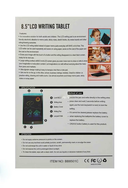تبلت جادویی کودکان رنگی 8.5اینچ آیتم BB8501C، نه آنقدر بزرگ است که جابهجایی آن دشوار باشد و نه آنقدر کوچک که فضای کافی برای نقاشی نداشته باشد. صفحه نمایش رنگی این تبلت باعث میشود طرحها و نوشتههای کودک جذابتر به نظر برسند و همین موضوع شوق کودک را برای استفاده بیشتر تحریک میکند. بدنه تبلت از پلاستیک بادوام و مقاوم ساخته شده و با وزنی سبک، به راحتی در دست کودکان جا میگیرد. قلم همراه تبلت نیز به گونهای طراحی شده تا استفاده بلندمدت از آن برای کودک راحت باشد و دست کودک خسته نشود.