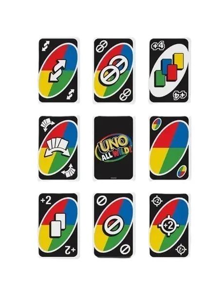 کارتهای ویژه: در UNO ALL WILD، کارتهای ویژهای مانند “کارت وحشی کشیدن دو”، “کارت وحشی کشیدن چهار”، “کارت وحشی رد کردن نوبت”، “کارت وحشی معکوس کردن” و “کارت وحشی تعویض دستها” وجود دارند که هر کدام عملکرد خاصی دارند. در نسخههای دیگر اونو، کارتهای ویژه معمولاً محدود به کارتهای کشیدن دو، کشیدن چهار، رد کردن نوبت و معکوس کردن هستند.