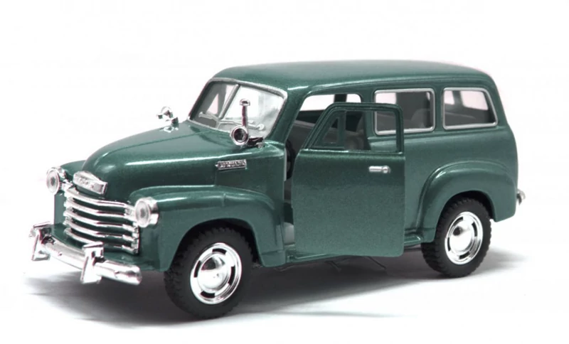 ماکت شورولت ساب اربَن 1950: طراحی دقیق در مقیاس 1/36 با طول 14 سانتیمتر، عرض 6 سانتیمتر و ارتفاع 4 سانتیمتر.