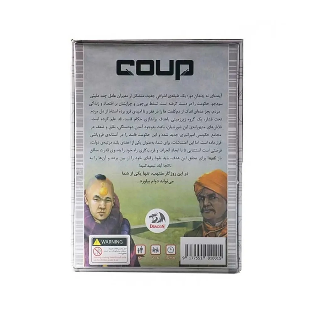 بازی فکری کودتا یکی از بهترین بازیهایی است که میشه توی دورهمیها انجام داد، چون ۲ تا ۶ نفر میتونند توش شرکت کنند. این بازی توسط برند دراگون طراحی شده و مدت زمان هر دور از بازی ۱۵ دقیقه هست. داستان بازی فکری کودتا از این قراره که گروه مقاومت بعد از موفقیتهایی که به دست آورده، حمایت مردمی رو جذب کرده و همه مناطق امپراتوری در شورش سراسری به سر میبرند. بعضی از افراد حکومت در تلاش هستند تا هر طور شده توی راس امور بمونند. اما در این بازی دیگه هیچ چیزی قابل پیشبینی نیست، سیاسته دیگه پدر و مادر نداره! در این بازی میتونید وفاداری رو با قیمت مناسب خرید و فروش کنید. هیچوقت فرصتی بهتر از این برای توطئه و فریب پیدا نمیکنید.