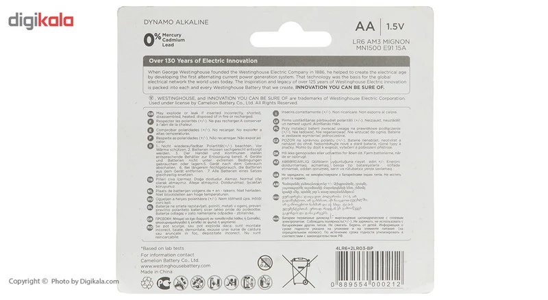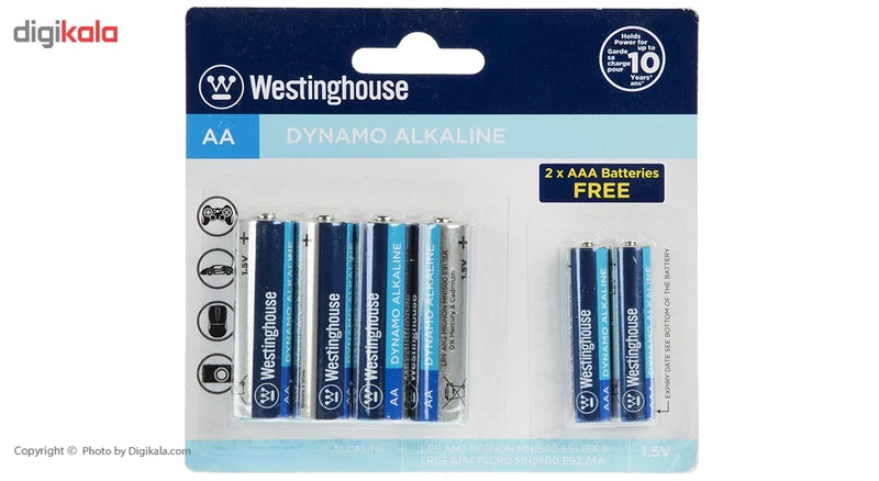 پک «Dynamo Alkaline» محصولی از شرکت «وستینگهاوس» (Westinghouse) و از سری باتریهای «آلکالاین» این شرکت است. این محصول شامل 4 عدد باتری نوع AA و 2 باتری نوع AAA با ولتاژ 1.5 ولت است. نوع تکنولوژی بهکاررفته در این محصول آلکالاین است و قابلیت شارژ مجدد ندارد. باتریهای AA که به باتری قلمی نیز شهرت دارند، در گستره وسیعی از کارهای روزمره کاربرد دارند. باتریهای که با تکنولوژی آلکالاین تولید شدهاند از باتریهای بادوام هستند. همچنین باتریهای سایز AAA که با نام باتریهای نیم قلمی در بازار شناخته میشوند، معمولا در لوازم دیجیتال با ابعاد کوچک مورد استفاده قرار میگیرد. این باتری برای دستگاههایی که نیازمند انرژی کم اما بهطور مداوم هستند بسیار خوب عمل میکند. برای مثال میتوانید از این سری از باتریها در ریموت کنترل، ساعتهای دیواری و رادیوها بهره ببرید. اگر به دنبال باتری با طول عمر بالا برای دستگاههای کممصرف خود هستید میتوانید استفاده از این باتری را مدنظر قرار دهید.