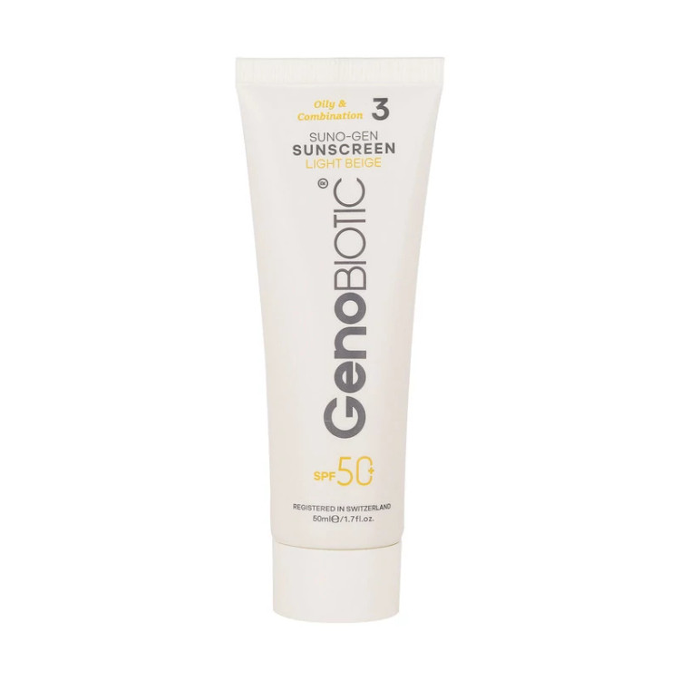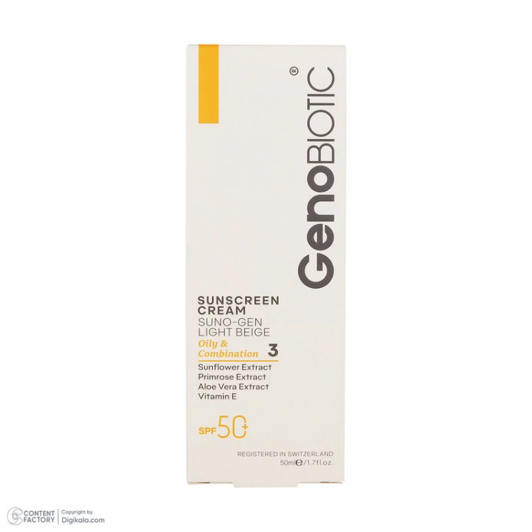 کرم ضدآفتاب رنگی ژنوبایوتیک SPF 50 مدل SUNO محافظ UVA ،UVB، مناسب پوستهای چرب، حجم 50 میلیلیتر