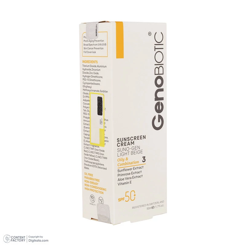 کرم ضدآفتاب رنگی ژنوبایوتیک SPF 50 مدل SUNO محافظ UVA ،UVB، مناسب پوستهای چرب، حجم 50 میلیلیتر