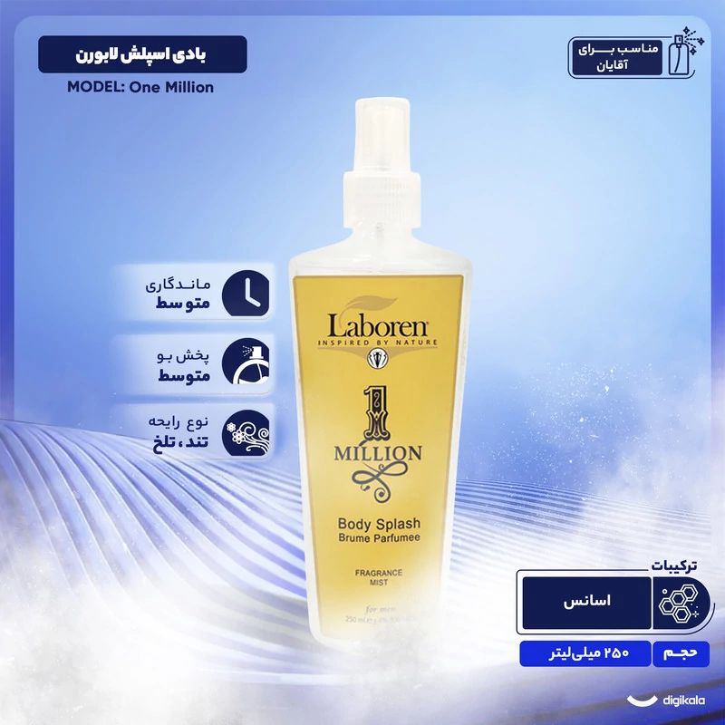 بادی اسپلش یا خوشبو کننده بدن، یکی از محصولات آرایشی بهداشتی است که این روزها به سبک زندگی (Life Style) اضافه شده است. میتوان آن را بعد از استحمام، قبل و بعد از ورزش و برای افزایش جذابیت استفاده کرد. بادی اسپلشهای مردانه و زنانه لابورن با رایحه عطرهای معروف دنیا، جذابیت شما را بیشتر میکنند. این محصول دارای پروانه بهداشتی ساخت شماره ۲۴۵۵/ظ/۵۶ است. بادی اسپلش مردانه وان میلیون لابورن، رایحه عطر وان میلیون از پاکو رابان را دارد و حاوی روغنها و مواد رطوبترسان قوی است. این ترکیبات علاوه بر از بین بردن بوی بد و کاهش تعریق، پوست را مرطوب، نرم و شفاف نگه میدارد. بادی اسپلش وان میلیون به صورت مایع روی بدن اسپری میشود و به دلیل عدم استفاده از گاز و مواد طبیعی، حساسیتزا نیست.