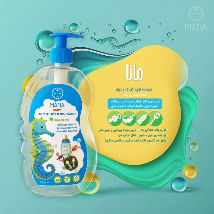 مایع شوینده و ضدعفونی کننده لوازم کودک و نوزاد مانا فاقد اسانس و رنگ بوده و مناسب شستشوی کامل انواع شیشه شیر، پستانک، آبمیوه خوری، ظروف کودک و اسباب بازی آنها می باشد.