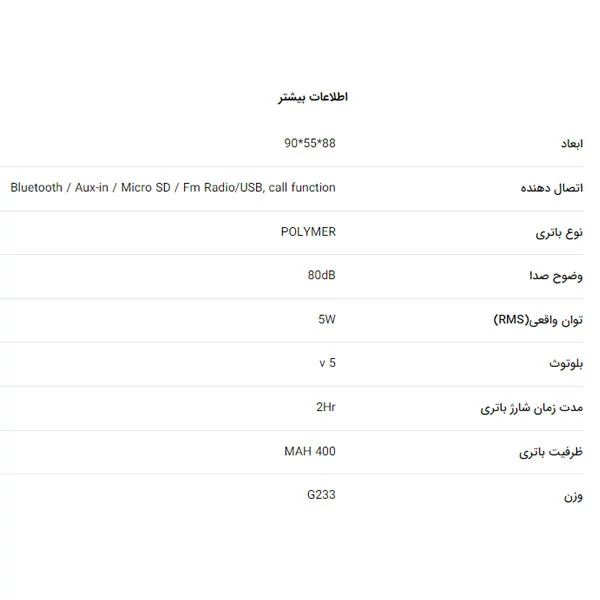 بهره مند از ورژن بلوتوث 5 است که قابلیت پشتیبانی تا فاصله ی 10 متری را دارد.دارای یک باتری پلیمری 400 میلی آمپری قابل شارژ است که حدود 2 ساعت زمان نیاز دارد تا بطور کامل شارژ شود.
