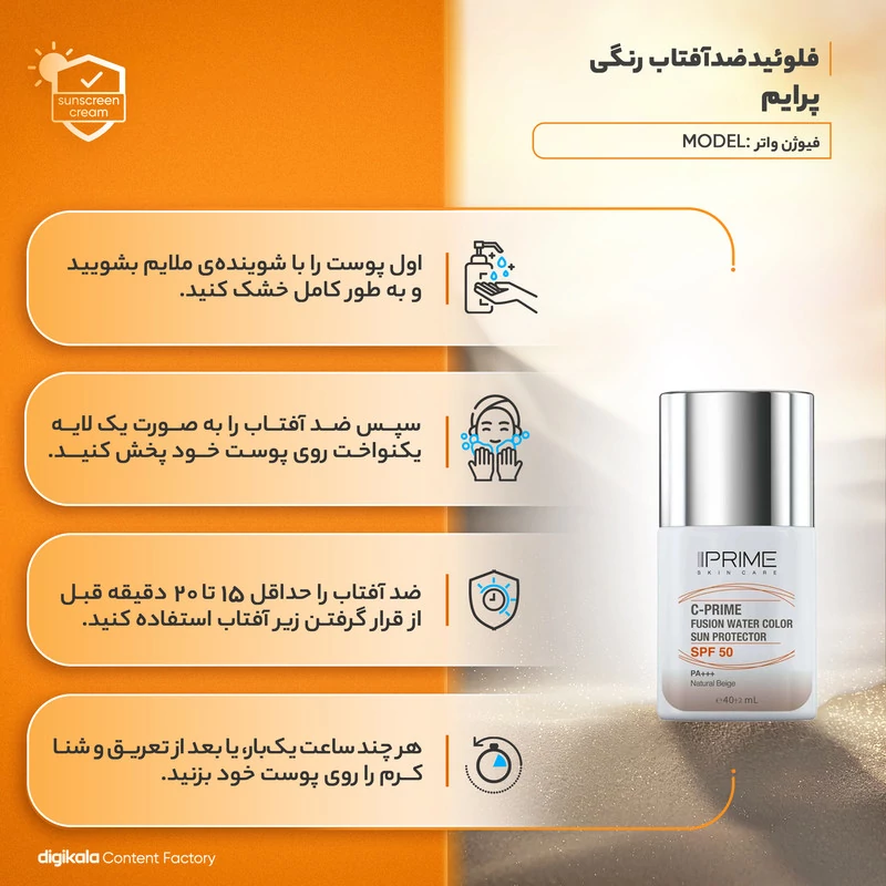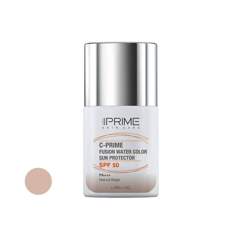 ضد آفتاب فیوژن واتر رنگ بژ طبیعی (نچرال بژ) پرایم دارای فرمولاسیون بر پایه آب و فاقد چربی است. این کرم ضد آفتاب که برای انواع پوست ها مناسب بوده و به راحتی روی پوست پخش شده و سرعت جذب بالایی دارد. این محصول حاوی رنگدانه هایی است که اثری مشابه با کرم های آرایشی یا بی بی کرم ها دارد و به یکنواخت سازی ظاهر پوست و پوشاندن لکه های تیره و قرمزی ها کمک می کند. این محصول یک ضد آفتاب طیف گسترده با SPF50 است که محافظت بالایی در برابر اشعه های مضر UVA، UVB، نور مرئی و مادون قرمز دارد. این کرم همچنین به نوعی ساخته شده که برای استفاده دور چشم نیز مناسب است. ویتامین سی و آنتی اکسیدان های موجود در آن از پوست در برابر آسیب های محیطی محافظت کرده و به حفظ رطوبت پوست کمک می کنند.