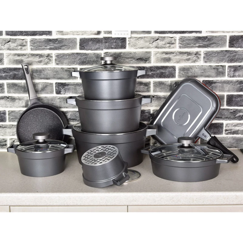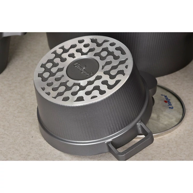 سرویس قابلمه 15 پارچه یونیک دیاموند کد 8521 یکی از جدیدترین، شیک ترین و باکیفیت ترین قابلمه های موجود در بازار می باشد. بدنه این سرویس از چدن مقاوم با پوشش داخلی گرانیت ضدخش می باشد. این قابلمه دارای 15 پارچه کاملا کاربردی و مصرفی می باشد که نیاز هر آشپزخانه ای می باشد که برای هر تعداد میهمان مناسب است.