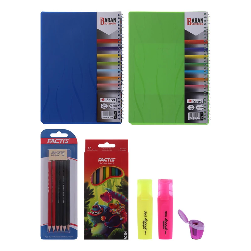 محتویات بسته: پاک کن, تراش, مداد, دفتر, ماژیک