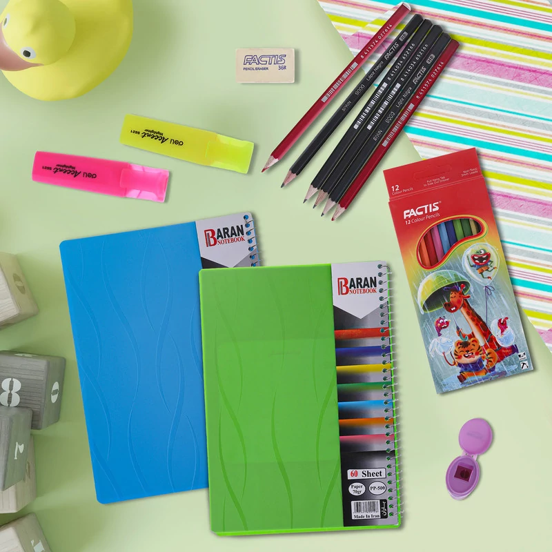 محتویات بسته: پاک کن, تراش, مداد, دفتر, ماژیک