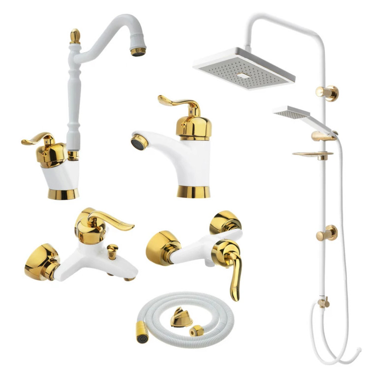 ست شیرالات قجری رنگ سفیدطلایی محصول شرکت شیرالات بهداشتی توفیق میباشد. این محصول بصورت پکیج کامل شامل ست 4 عددی شیرالات اهرمی به همراه علم دوش حمام پرفشار و شلنگ سرویس بهداشتی ست عرضه میگردد. پکیج شامل: 1 عدد شیر روشویی 1 عدد شیر حمام 1 عدد شیر آشپزخانه 1 عدد شیر سرویس بهداشتی 1 عدد علم دوش دوکاره حمام پرفشار 1 عدد شلنگ سرویس بهداشتی میباشد. این محصول دارای بالاترین سطح استاندارد های حال حاضر صنعت شیرالات میباشد. کاتریج این شیرالات از مرغوبترین نوع سرامیکی مقاوم در برابر جرم و رسوب میباشد و کارتریج سایز بزرگ با قطر 40 می باشد. تمامی لوازم جانبی جهت نصب نیز در داخل بسته بندی موجود است. جنس این شیرالات تماما از شمش برنج میباشد