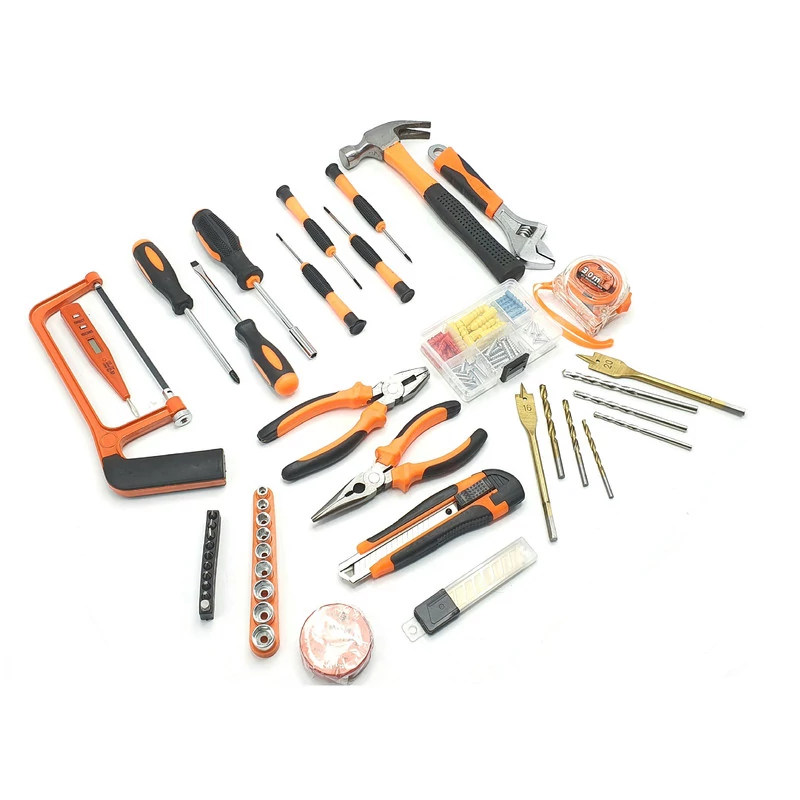 محتویات مجموعه: انبر دم باریک, انبردست, پیچ, پیچ گوشتی, تیغ کاتر, چسب, چکش, دریل, رولپلاک, کاتر, متر, مته