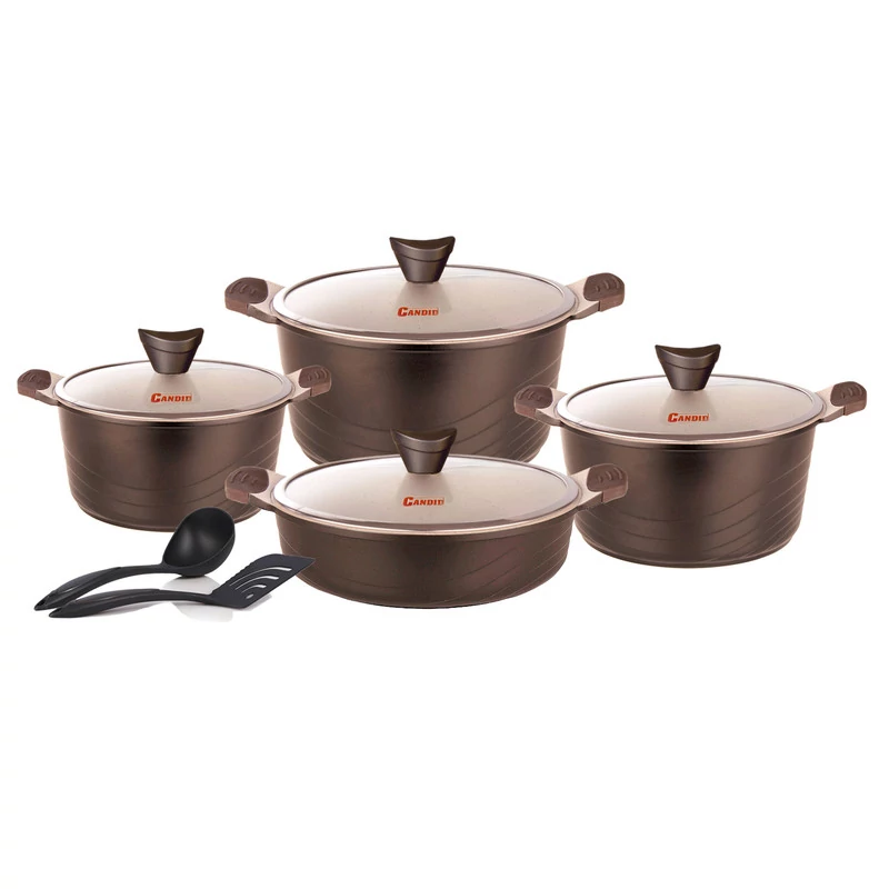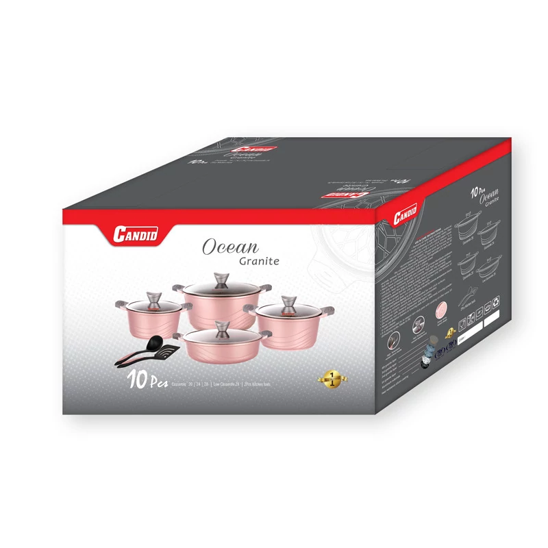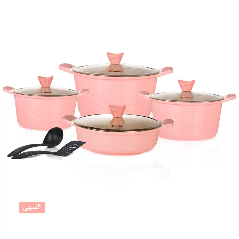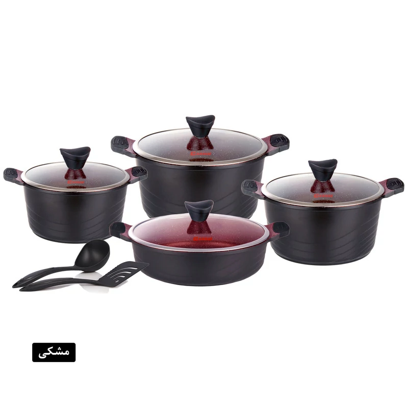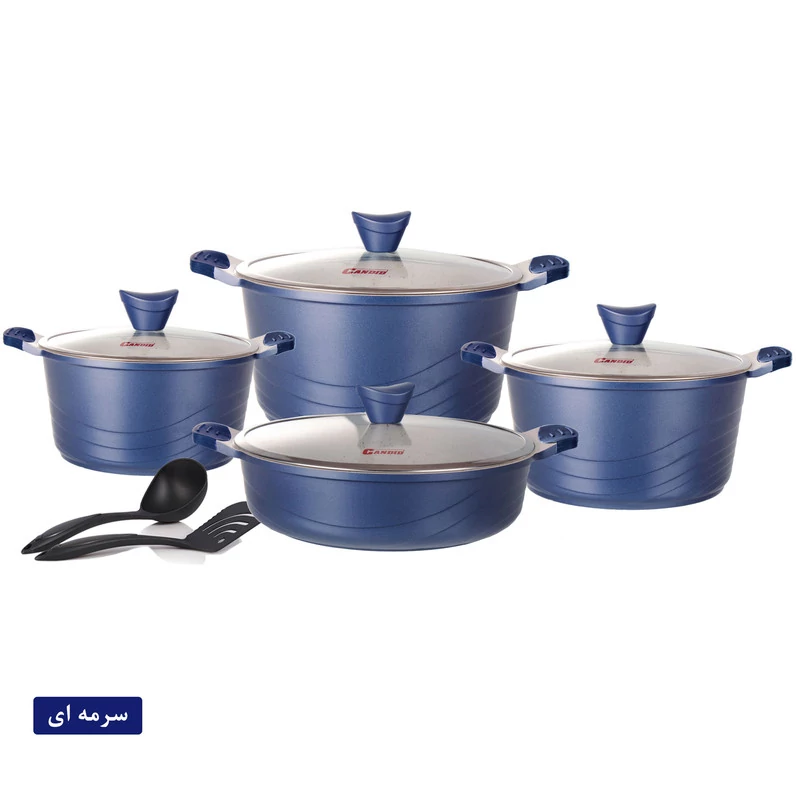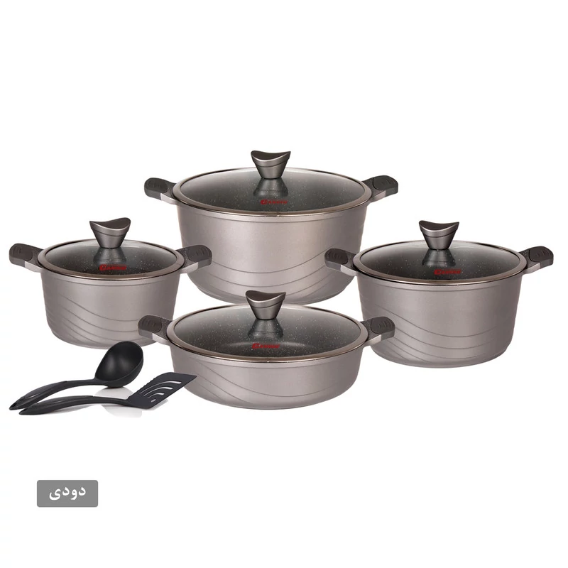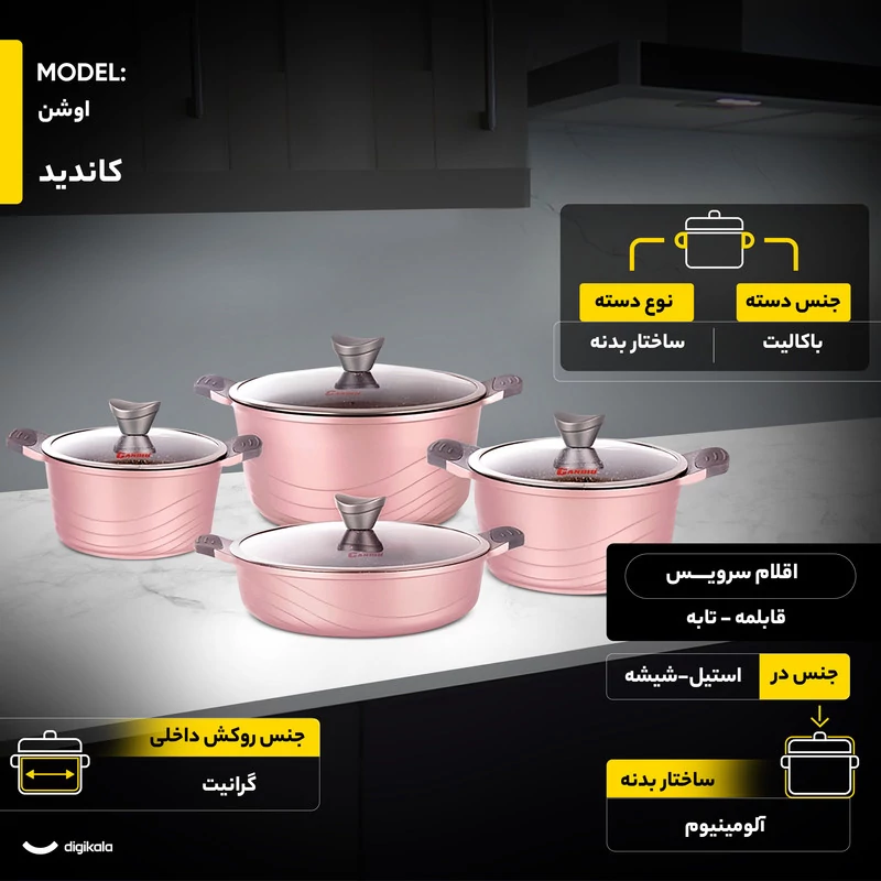 سرویس پخت و پز 10پارچه کاندید مدل اوشن مشخصات فنی محصول: ** مشخصات کلی ** نوع: سرویس قابلمه و تابه اقلام سرویس: قابلمه, تابه, کفگیر, ملاقه تعداد پارچه: 10 پارچه وزن بستهبندی: 7 کیلوگرم کشور مبدا: ایران ابعاد بستهبندی: 52 × 33 × 34 سانتیمتر ** سایز ظروف ** سایز قابلمهها: 20 سانتیمتر, 24 سانتیمتر, 28 سانتیمتر سایز تابه دو دسته: 28 سانتیمتر ** ویژگیهای ظاهری ** ساختار بدنه: آلومینیوم جنس روکش داخلی: گرانیت جنس در: استیل-شیشه جنس دسته: باکالیت جنس دستگیره روی در: باکالیت نوع دسته: ساختار بدنه ** قابلیتها ** سایر توضیحات: پوشش داخلی این محصول گرانیت , و پوشش خارجی سیلیکونی است. سازگار با: اجاق گاز ویژگیهای خاص: طراحی مناسب جهت پخش بهتر گرما