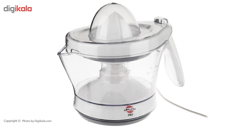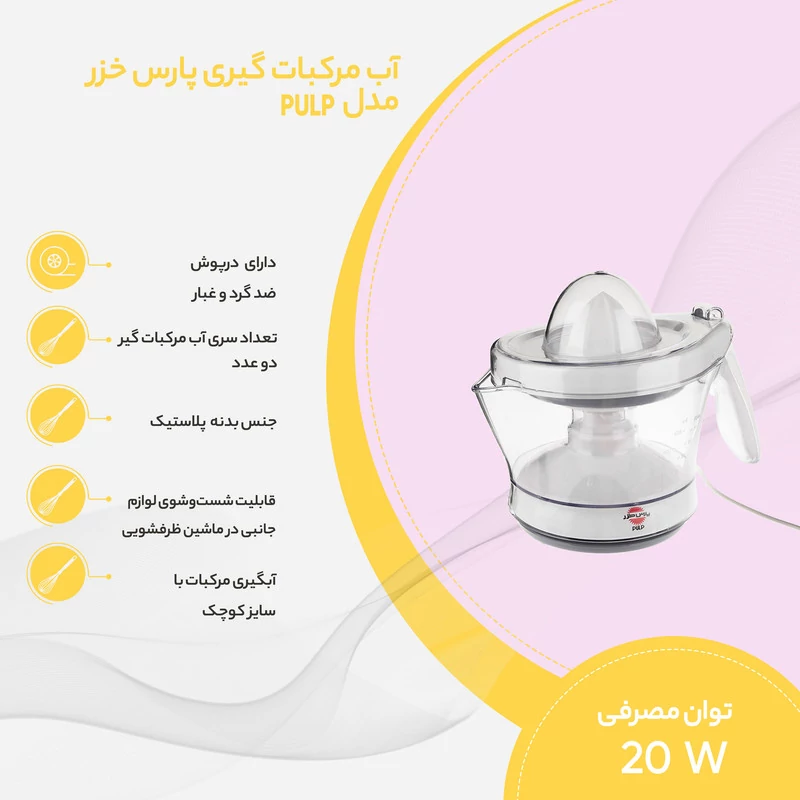 آب مرکبات گیری «پارس خزر» (Pars Khazar) مدل PULP، ساده، ارزان، سبک و درعینحال، بسیار کاربردی طراحیشده است. این آب مرکبات گیری تککاره، با گنجایش مخزن آبمیوه گیری 0.6 لیتر به همراه فیلتر قابل شستشو طراحی و ساختهشده است. همچنین توان مصرفی این محصول به 20 وات و طول سیم برقاش به 1.2 متر میرسد. از دیگر مشخصات کلی این محصول میتوان به سری مخصوص جهت آبگیری مرکبات در اندازه بزرگ، دارای سری اضافی جهت آبگیری لیموترش، دارای قطعات جداشدنی و قابل شستشو در ماشین ظرفشویی، قابلیت تعیین درجه لرت میوه در 5 وضعیت، قابلیت شروع به کار خودکار محصول، قابلیت چرخش موتور محصول در دو جهت برای آبگیری بهتر، مجهز به 3 پایه لاستیکی ضد لرزش در کف محصول و دارای کاور پلاستیکی شفاف محفظه آب مرکبات گیر جهت جلوگیری از نشستن گردوغبار اشاره کرد. در نظر داشته باشید که پارس خزر، یک شرکت بزرگی ایرانی است که از سال 1347 با همکاری شرکت توشیبا ژاپن، آغاز به کار کرده است. این شرکت در زمینههای ساخت لوازمخانگی، فعالیتهای گستردهای را در کشور انجام میدهد.