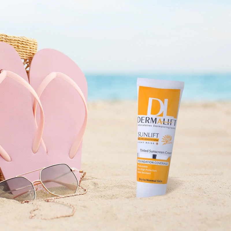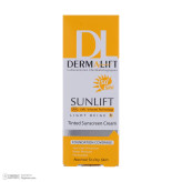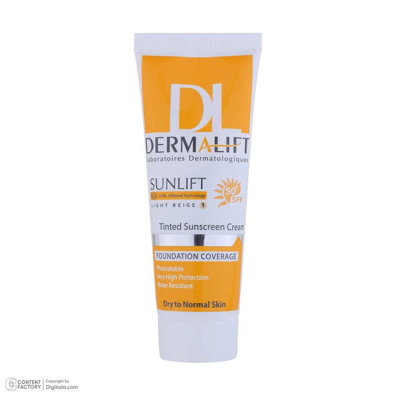 کرم ضد آفتاب رنگی درمالیفت، SPF50، مدل سانلیفت، مناسب پوست خشک و معمولی تنالیته رنگ روشن و حجم 40 میلیلیتر، محافظت کننده در برابر اشعه UVA، UVB و IR، مقاوم در برابر آب، دارای فرمولاسیون شیمیایی، با ماندگاری 3 ساعته
