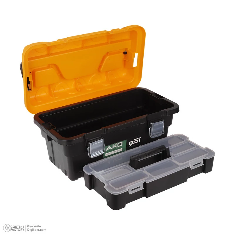 این جعبه دارای 2 طبقه و 9 محفظه کالا است که به راحتی میتوان ابزارهای مختلف را در آن سازماندهی کرد. جنس آن از پلاستیک باکیفیت تهیه شده که علاوه بر جلوگیری از آسیبدیدگی، وزن سبکتری نسبت به جعبههای فلزی دارد.