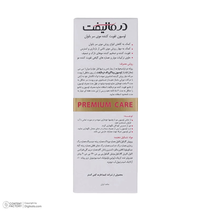 لوسیون تقویت کننده مو بانوان ویتا گرو درمالیفت حاوی جدیدترین و موثرترین ترکیبات ضد ریزش و ضد چربی است. به همین خاطر علاوه بر تقویت رشد فولیکولهای ضعیف و جلوگیری از ریزش موهای سر در اثر عوامل مختلف، باعث ایجاد تعادل در ترشح چربی از غدد سباسه پوست سر میشود. ما روزانه بین 80 تا 100 تار مو را از دست میدهیم که طی ماه آینده با موهای جدید جایگزین میشوند. به این ترتیب مو حجم خود را از دست نمیدهد. اما در صورتی که حجم مو کاهش پیدا کند و حتی در برخی از نواحی پوست سر مشاهده شود، حتما باید به سراغ استفاده از محصولات تقویت کننده مو مانند لوسیون تقویت کننده مو، تونیک مو و سرم تقویت کننده مو رفت. چنین محصولاتی به کاهش انواع ریزش موی سر بانوان کمک نموده و با ترکیبات موثر و عصارههای گیاهی باعث تقویت و ضخیم شدن موهای نازک و ضعیف میشوند.