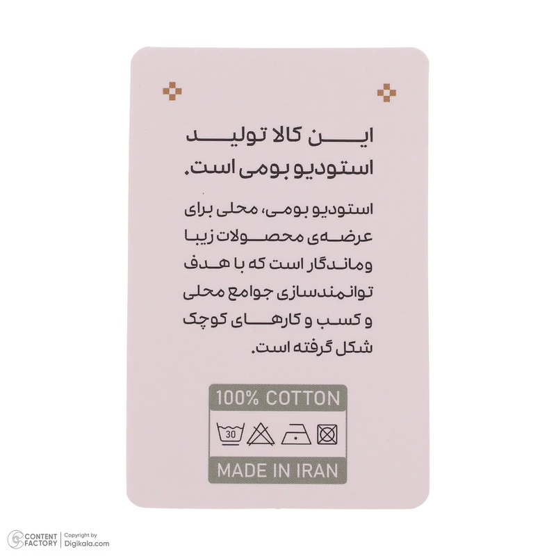 این کالا تولید استودیو بومی است. استودیو بومی، محلی برای عرضه محصولات زیبا و ماندگار است که باهدف توانمند سازی جوامع محلی و کسب کارهای کوچک شکل گرفته است.