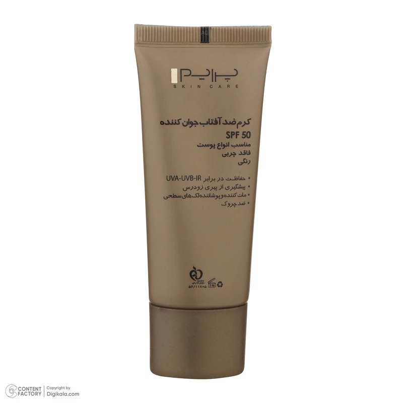 برای رفع لکهای صورت، جلوگیری از افزایش لکها و حتی در برخی موارد تغییر رنگ پوست، کرمهای جداگانهای تهیه شده است اما شرکت «پرایم» (Prime) کرم ضدآفتابی را طراحی کرده است که این 3 ویژگی را باهم دارد. این کرم از نوع کرم پودری است بدین معنی که با قراردادن آن روی پوست، رنگ آن بهرنگ بژ درمیآید. این محصول میتواند از پوست دربرابر اشعههای UVA، UVB و IR از پوست محافظت کند. این اشعهها موجب پیری، شکنندگی و انواع بیماریها برای پوست میشوند. هرچند که کرمهای مختلف برای پوستهای مختلف بهطور جداگانه طراحی شدهاند اما این کرم برای انواع پوستها قابل استفاده است. این کرم حاوی عصاره انگور است. مواد استفاده شده در این کرم مانع از چروک پوست میشود و آن را بهخوبی مرطوب میکند. جذب سریع این کرم آرایشی از دیگر ویژگیهای این کالا است که آن را برای استفاده بهعنوان یک پایه آرایشی مناسب میسازد. عصاره تاک در نظر گرفته شده در این کرم میتواند به عنوان جوانکننده پوست استفاده شود. SPF مادهای است که میزان آن میتواند بهعنوان مقدار محافظت کنندگی کرم دربرابر آفتاب درنظر گرفته شود. SPF این کرم 50 است بنابراین از آن میتوان در فصول تابستان که تابش آفتاب زیاد است استفاده کرد. این کرم سرشار از ویتامین E با خواص آنتی اکسیدانی قوی است.