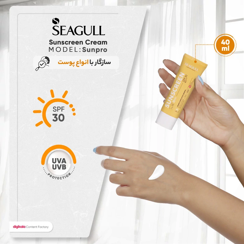 اگر میخواهید که اشعههای آفتاب بر روی پوست شما اثر مخرب نداشته باشند، استفاده از ضد آفتاب را جدی بگیرید. ضد آفتاب میتواند پوست شما را در برابر اثرات منفی که اشعههای مضر خورشید بر روی آن میگذارد، محافظت کرده و از بوجود آمدن چینها بر روی پوست جلوگیری کند. برند سی گل سری ضد آفتابهای خود را تحت نام Sun Pro ، برای حالتهای مختلف عرضه کرده که هر کدام از آنها با دارا بودن خواصی، میتوانند از پوست مراقبت کرده و حتی آنرا تقویت و یا ترمیم کنند. یکی از این محصولات، کرم ضد آفتاب و مرطوب کننده با SPF30 است. این تیوپ 40 میلی لیتری مناسب برای افراد با پوست معمولی است. وجود ویتامین E در ترکیب آن ضمن تقویت پوست به مرطوب شدن ان نیز کمک میکند. همچنین دارای فیلترهایی برای محافظت از پوست در برابر اشعههای ,UVA UVB و IR است. این کرم رادیکالهای آزاد را از پوست دور کرده و قدرت دفاعی پوست را بالا میبرد. استفاده از آن سبب میشود تا به دلیل دارا بودن آنتی اکسیدان، از ضایعات پوستی جلوگیری کند. استفاده از ضد آفتاب میتواند ضمن ابجاد سد محافظتی قوی در برابر آفتاب، به عناون پایهی آرایش هم در نظر گرفته شود. یادتان باشد. هر روز باید از این محصول استفاده کرده و حداقل 30 دقیقه قبل از خروج از منزل و قرار گیری در معرض آفتاب آن را بر روی پوست خود بمالید. همین طور در صورت تعریق زیاد، آن را تجدبد کنید. با خرید این محصول بهترین مراقبت را از پوستتان به عمل آورید.